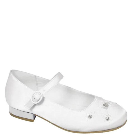 These gorgeous white communion shoes from Dubarry come with an adjustable single strap along with floral detailing that is decorated with silver stones. Perfect for her special day! Uppers: Manmade. Lining: Manmade. Sole: Manmade. Heel Approx: 2cm.