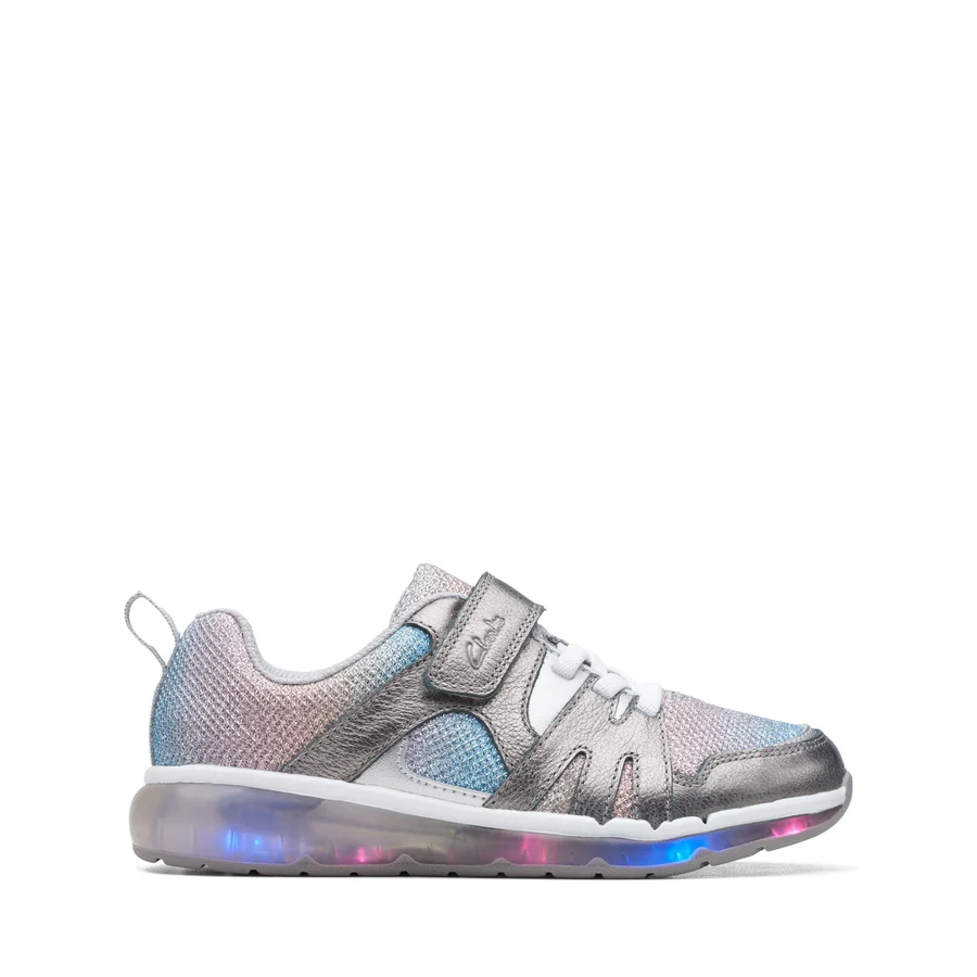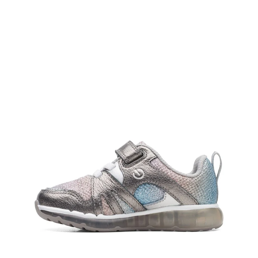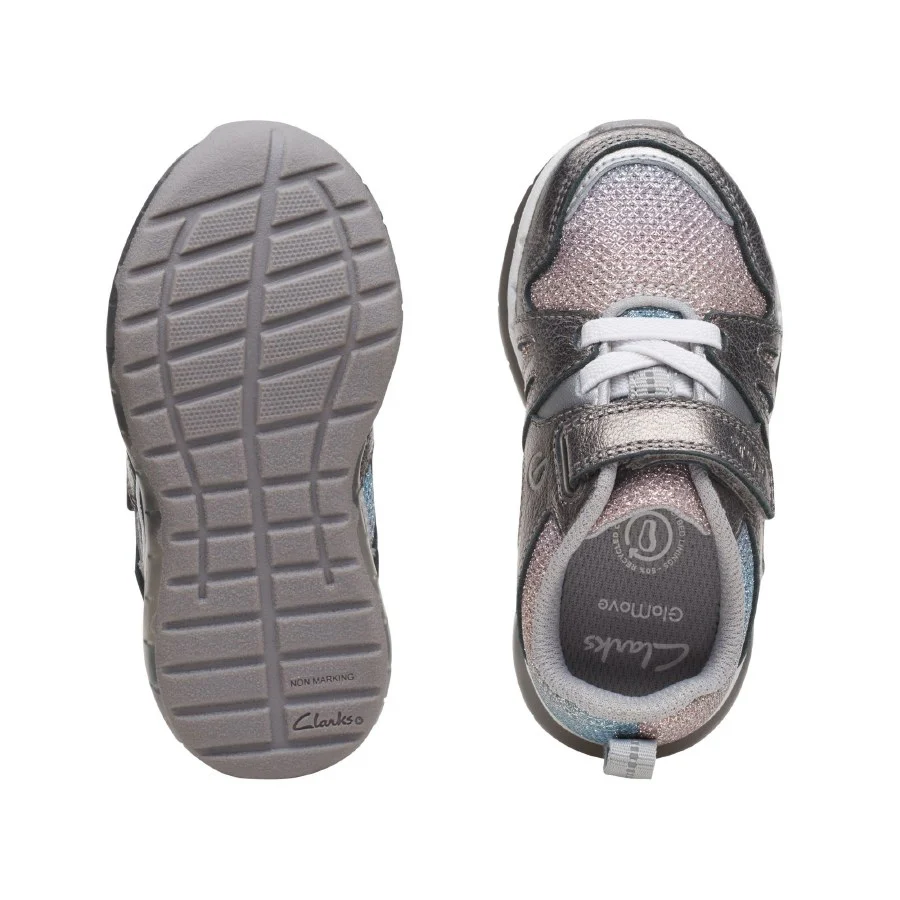 A fancy little fit for the fashion-lovers, our Spark Sparky kids’ sneaker from Clarks is perfect for active little feet. With shimmery lilac leather uppers and glittery fabric, they’ll be shining all day long – while a bouncy footbed and grippy sole surround busy feet in feel-good style. UPPER MATERIAL Leather. LINING MATERIAL Textile. SOLE MATERIAL TPR. FASTENING TYPE ElasticLace RipTape.