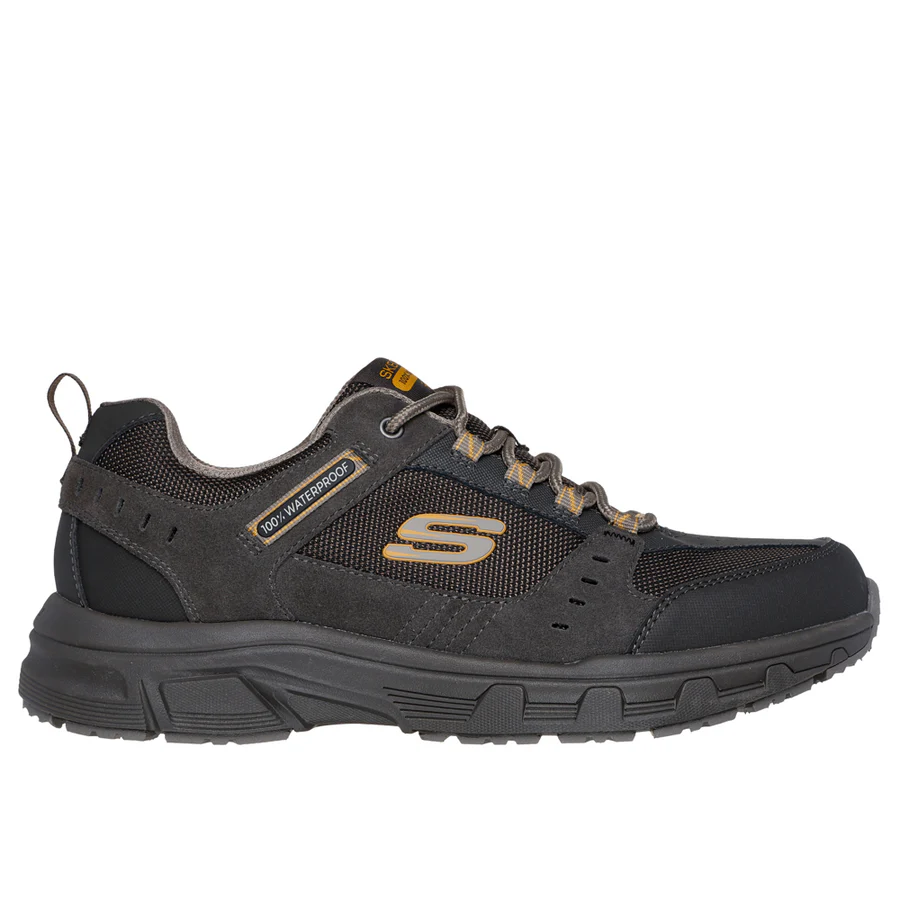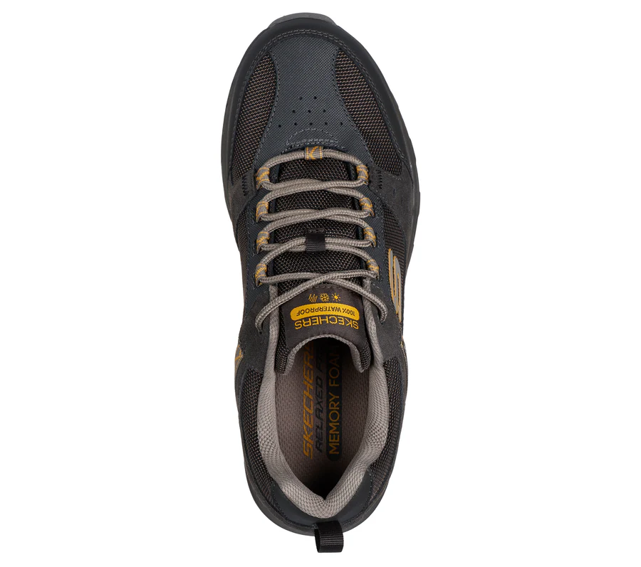 Head outside rain or shine wearing Skechers Relaxed Fit®: Oak Canyon – Rydell. This 100% waterproof outdoor lace-up features a roomy suede, synthetic, and mesh upper with a cushioned Skechers Memory Foamâ„¢ insole.