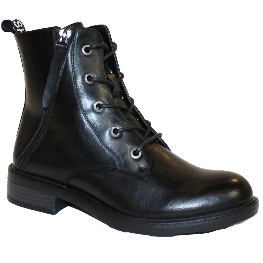 These military style ladies ankle boots from Susst come with a full inner zip and laces with metallic eyelets. The decorative outer zip adds interest while the low block heel provides support. Perfect for Autumn/Winter casual wear. Uppers: Manmade. Lining: Manmade. Sole: Manmade.