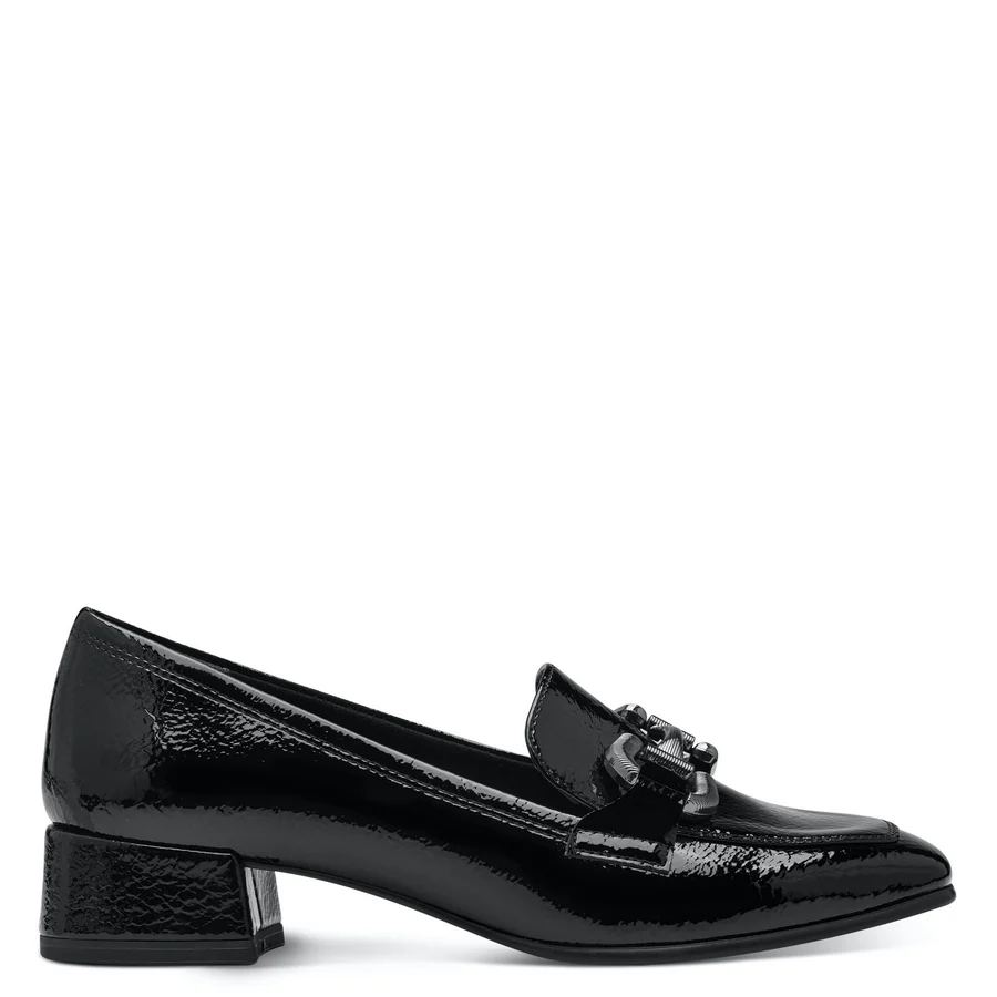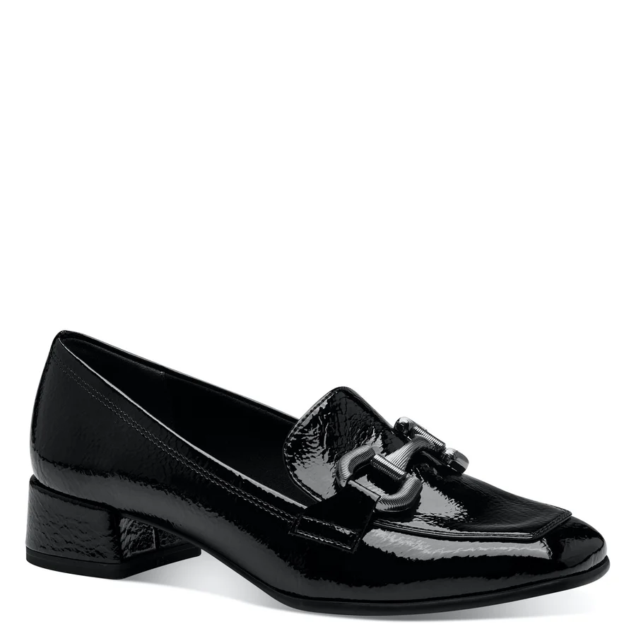 Step into sophistication with the Tamaris 24316 Ladies Shoes. Crafted from premium black patent synthetics, these loafers feature a sleek 6cm block heel and a stylish flat shoe tip. The luxurious leather and textile insole provides all-day comfort, while the textured outsole completes the look.